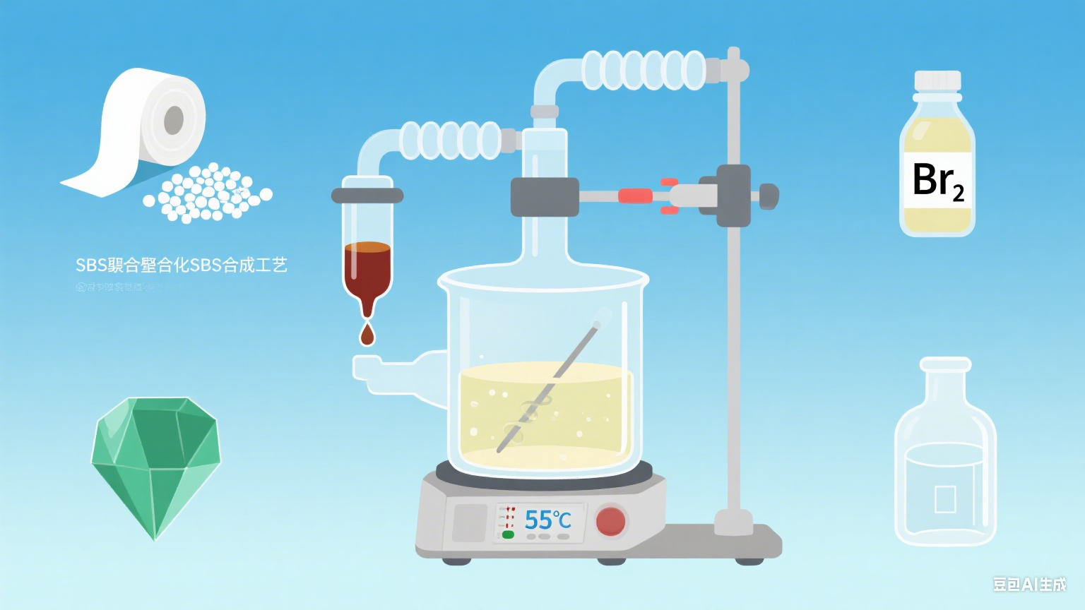 在溶液中加入適量的溴素(Br?),開始溴化反應。該反應通常在一定溫度下進行,常見的反應溫度為40-70°C。在反應過程中,溴分子與SBS中的不飽和雙鍵發生加成反應,生成溴化SBS。